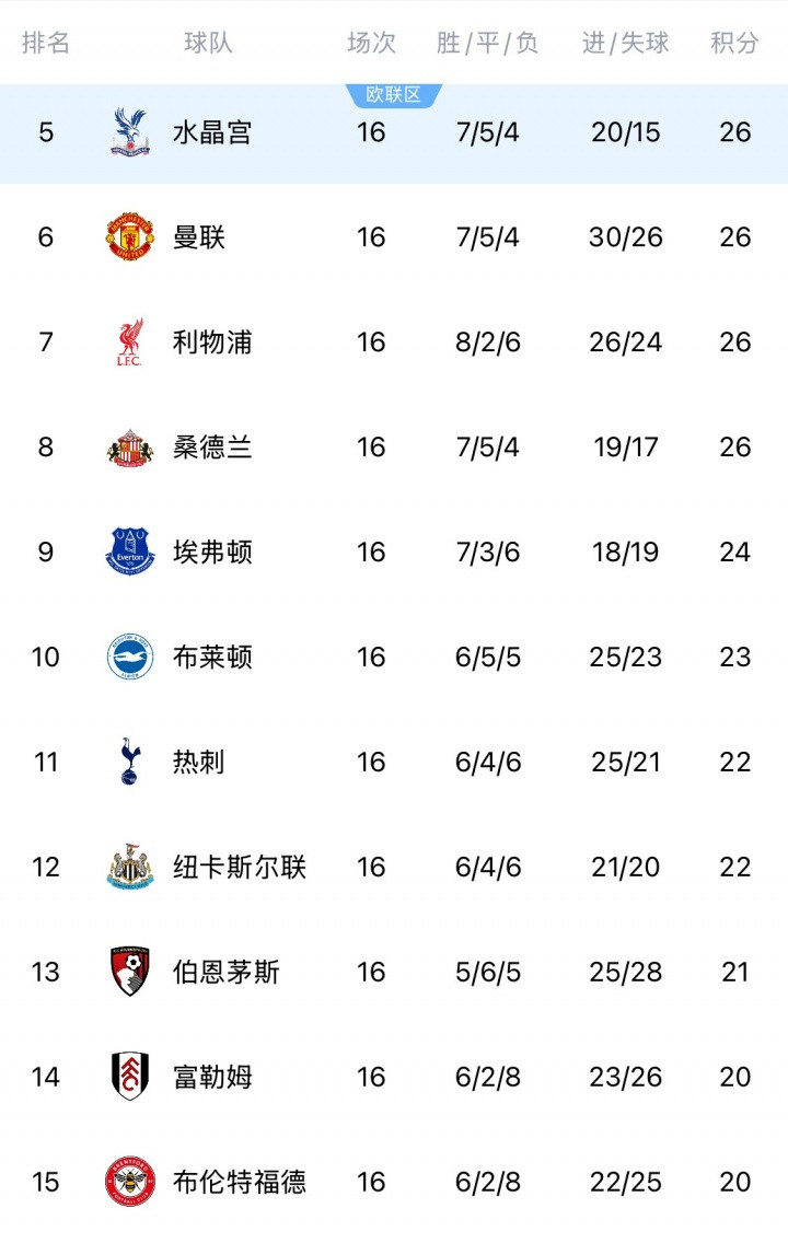英超第16轮战罢,前三强与后面的球队拉开分差。英超从第5(水晶宫)到第15(布伦特福德)之间,仅相差6分。其中第5水晶宫、第6曼联、第7利物浦、第8桑德兰同积26分。